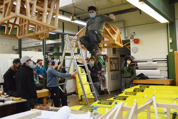 Die Praxistauglichkeit wurde mehrfach getestet - vom Obermeister der Zimmerer-Innung Oberland Michael Andrä und weiteren Azubis im 3. Lehrjahr der Klasse BZ 12a. Zunächst pumpten sie die Kissen mit einem Gebläse auf, pro Luftsack dauert das rund 30 Sekunden.